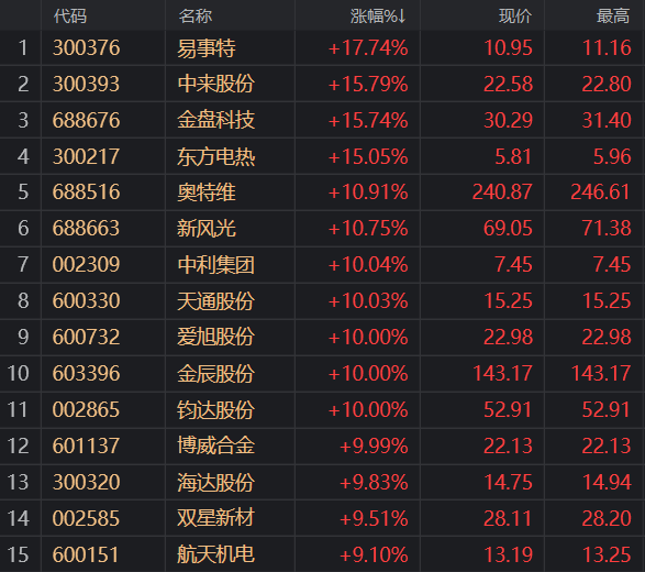 财联社(上海,编辑 梓隆)讯,今日,光伏概念板块大幅走强,多只个股涨停,截止午间收盘,中利集团、天通股份、爱旭股份、金辰股份、钧达股份、博威合金涨停,易事特涨逾17%,中来股份(维权)、金盘科技、东方电热涨逾15%,奥特维、新风光涨逾10%。