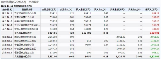 在这波暴涨期间,南岭民爆多次登上深交所龙虎榜,11月8日~10日的龙虎榜累计数据显示,国盛证券的5个营业部集中成为前买5席位,累计净买入超过6000万元。如果今日这5个营业部未能及时出逃的话,有很大几率高位被套。