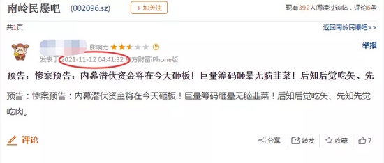 南岭民爆股吧的发贴显示,早在今日清晨4:41分,也就是开盘前约5小时时,有网友发贴声称:“预告:惨案预告:内幕潜伏资金将在今天砸板!巨量筹码砸晕无脑韭菜!后知后觉吃矢、先知先觉吃肉”。