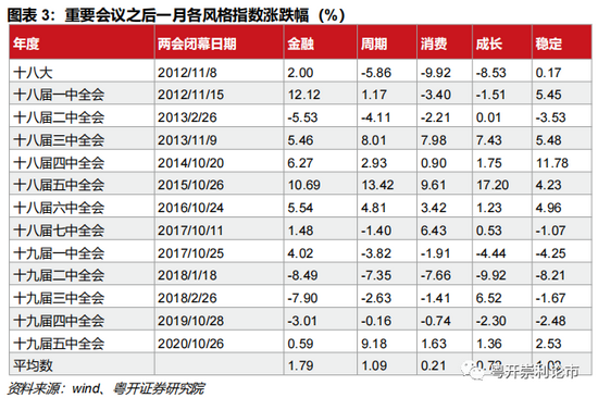 一般来看,重要会议时期市场会相对稳定,改革政策预期较多,市场情绪相对更乐观,风险偏好得到提升。我们统计了十八大以来历次全会召开之后A股市场表现,统计结果表明会议召开后一月和一季度上证指数上涨概率较大,分别为54%和62%。