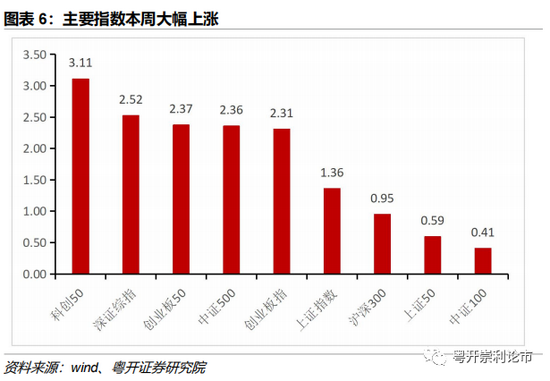本周市场呈现V型走势,上证、深证和创业板指数分别上涨1.36%,2.56%和2.31%。中小市值科创企业走势好于大盘股。