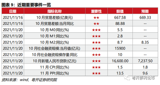 从日均成交额来看,较此前有明显修复,但相较于8月底9月初的高位还有20%~30%左右的差距,后续趋势性的上涨还需要成交量的进一步配合。从基本面来说,随着三季报披露完毕当前处于A股的相对真空期,临近年底有多个重磅会议召开,密切关注政策面的边际变化对宏观经济以及中观行业带来的影响,对明年资产及行业配置有重要的指导意义。