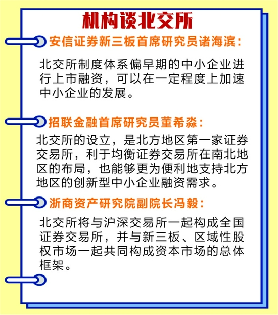 对于中小企业上市融资来说,巨丰投顾投资顾问总监郭一鸣对证券时报记者表示,北交所的设立具有重要的意义:一方面,中小企业融资一直是个难题,北交所有望进一步提升服务中小企业的能力,为中小企业带来服务升级;另一方面,对于创新型的中小企业来说,能够进一步得到资本的支持,在解决融资贵、融资难问题上有望得到进一步的支持和帮助;此外,北交所的设立,也有望吸引更多企业入驻,培育一批“专精特新”中小企业,引领中小企业创新发展,为后疫情时代的经济贡献新的力量。