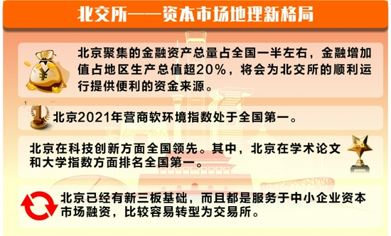 在3家证券交易所中,北交所的差异化定位凸显在聚焦服务创新型中小企业,探索资本市场发展普惠金融的“中国方案”。不少分析观点认为,北交所的这一定位有着先天的优势,在投资端,北京聚集的金融资产总量占全国一半左右,金融增加值占地区生产总值超20%,将会为北交所的顺利运行提供便利的资金来源;在融资端,北京营商软环境、科技创新力全国领先,服务科创民营小微企业的政策体系相对完善。