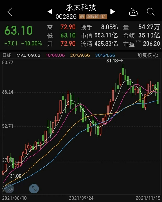 锂电池板块今日全线下跌,昨日刚刚获得宁德时代入股子公司的永太科技,收盘封死跌停。盘后龙虎榜显示,一家机构今日买入5683万元,另外还有两机构合计卖出2.25亿元。永太科技早盘开盘涨幅近4%,盘中最高触及72.9元高点。随后不到4分钟,其股价直线下挫,于9点43分跌停。这意味着,追高的股民短短13分钟浮亏13.44%。数据宝统计显示,永太科技今年截至11月13日股价涨幅高达536%。