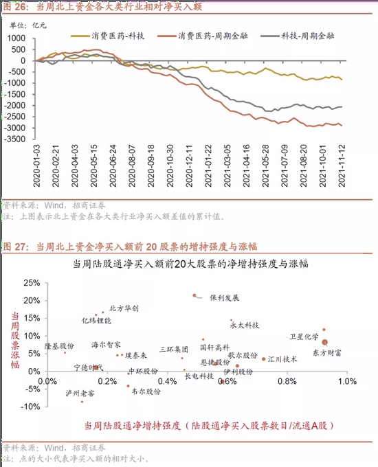 11月8日-11月12日,陆股通资金净流出26.9亿元。行业偏好上,电气设备、计算机、非银金融这三个行业净买入规模较高,买入金额分别为34.0亿元、21.0亿元、15.9亿元。净卖出规模较高的行业是医药生物、家用电器、有色金属等行业。个股方面,净买入规模较高的主要包括东方财富(+27.6亿元)、宁德时代(+21.3亿元)、伊利股份(+14.6亿元)等;净卖出规模较高的主要包括格力电器(-19.4亿元)、万科A(-11.8亿元)、恒瑞医药(-8.6亿元)等。