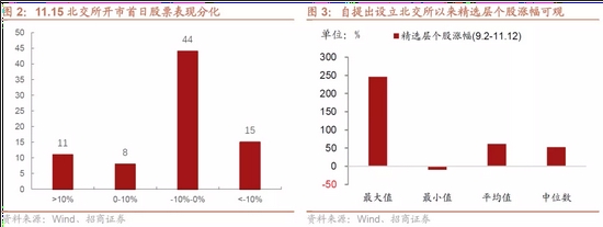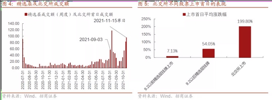 ? 北交所开市新老个股表现分化,成交活跃度进一步提高。北京证券交易所15日正式鸣锣开市,首批上市的81家公司中,71家是从新三板精选层中平移而来,另有10家公司作为新股上市。开市首日新老个股走势分化,10只新股集体大涨,而从精选层平移过来的公司股票表现不佳,近60只个股出现下跌。开市首日交易额为95.73亿元,已经超过上周精选层全周成交额,北交所个股的流动性较之前精选层有明显提升。另外,北交所宣布成立及北交所开市对于新股上市首日表现有较为明显的提振作用。