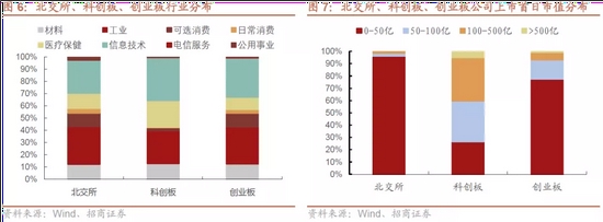 行业分布来看,根据WIND一级行业来划分,北交所81家上市公司主要集中在材料、工业、医疗保健和信息技术,累计覆盖数目占比达82.72%,与科创板与创业板上市公司行业分布占比较为重合。而从市值分布来看,根据上市首日总市值统计,与创业板、科创板不同的是,北交所上市公司市值主要集中于0-50亿,更确切地说是集中在20亿以下。两者相结合,这体现了北交所不仅延续科创板、创业板所聚焦创新型企业,同时更专注于对中小企业的支持。北交所的设立进一步完善多层次资本市场的建设,并将加强对“专精特新”企业的服务和融资支持。