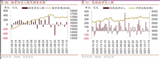 资金供给方面,11月8日-11月12日,新成立偏股类公募基金87.3亿份,较前期减少154.6亿份。股票型ETF较前期净申购,对应净流入74.5亿元。全周整个市场融资净买入107.2亿元,从前期净流出转为净流入,截止11月12日,A股融资余额为16980.2亿元。陆股通资金本周净流出,当周净流出规模为26.9亿元,从前期净流入转为净流出。