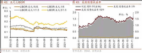 11月8日-11月12日,短、长端美债收益率上行,利差扩大。美国1年期国债收益率上行3.0bp至0.17%,10年期国债收益率上行13.0bp至1.58%,利差扩大10.0bp至1.41%,截止11月12日,美元LIBOR均上涨,隔夜LIBOR上升0.21bp,1周LIBOR上升0.34bp,1个月LIBOR上升0.05bp,3个月LIBOR上升1.23bp。