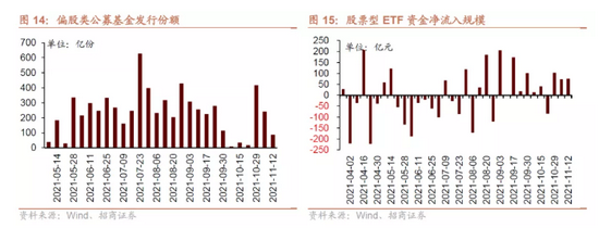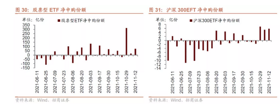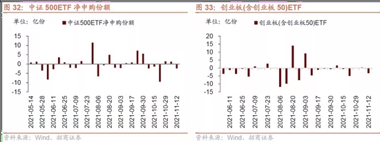 11月8日-11月12日,ETF净申购,当周净申购73.8亿份,宽指ETF申赎参半,其中上证50ETF申购较多,双创50ETF赎回较多;行业ETF申赎参半,其中医药ETF申购较多,军工ETF赎回较多。具体的,沪深300ETF净申购5.8亿份;创业板ETF净赎回3.3亿份;中证500ETF净赎回2.4亿份;上证50ETF净申购6.8亿份。双创50ETF净赎回5.0亿份。行业方面,信息技术ETF净赎回14.5亿份;消费ETF净申购15.4亿份;医药ETF净申购20.3亿份;券商ETF净赎回9.5亿份;金融地产ETF净申购8.2亿份;军工ETF净赎回19.6亿份;原材料ETF净申购0.1亿份;新能源&智能汽车ETF净申购4.5亿份。