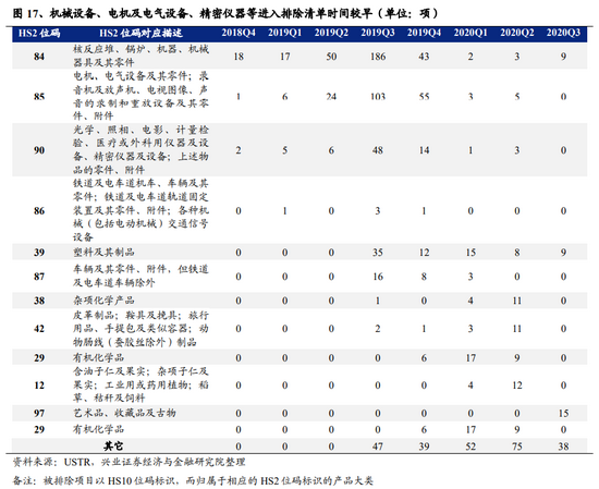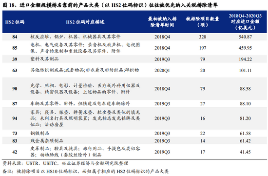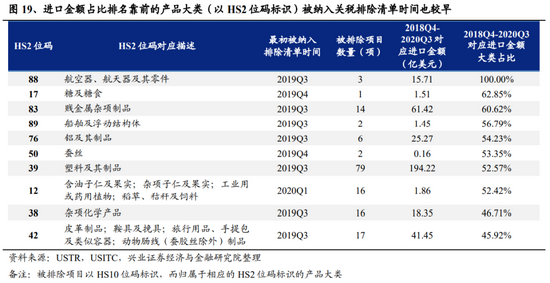 从对产品大类的进口金额占比来看,航空航天器、糖、贱金属、船舶等产品占比均在50%以上,而塑料制品、纺织品、机械设备等产品即使所属大类的进口规模本身较大,但排除清单纳入的项目金额进口占比也均超过20%,再次印证这些商品在在美国进口商品中的重要性。而对应最初被纳入排除清单的时间来看,占比居前的品类多在2019Q3被纳入,纳入时间也相对较早。值得注意的是,进口规模偏小的糖、蚕丝、含油子仁等被纳入排除清单时间相对较晚,如进口规模为1.86亿美元的含油子仁,被纳入排除清单的时间为2020Q1。
