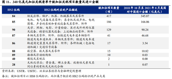 在首批加征关税清单中,机械设备、电机及电气设备、精密仪器等品类被加征项目数量居前,且美国对中国进口金额排名同样居前。以被加征项目数量和美国对中国进口额为依据,测算340亿美元加征关税清单中重要性居前的品类。从项目数量来看,机械设备(HS2位码为84,417项)、电机及电气设备(HS2位码为85,186项)和精密仪器(HS2位码为90,129项) 是被加征项目最多的产品大类;从美国对中国进口金额来看,测算2018年10月至2021年8月的进口金额,机械设备、电机及电气设备、精密仪器同样处于前三位,对应进口金额分别为345.87亿美元、166.06亿美元和90.24亿美元。