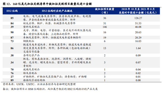 在第二轮160亿美元加征关税清单中,塑料、电机及电气设备和机械设备大类的被加征项目数量及对应进口金额居前。2018年8月8日,美国贸易代表办公室宣布,美国已最后确定了被加征25%关税的价值约160亿美元的中国进口产品清单,关税将从8月23日起开始征收。在160亿美元的加征关税清单中,从项目数量来看,塑料制品(HS2位码为39,146项)、电机及电气设备(HS2位码为85,36项)和机械设备(HS2位码为84,31项)是被加征项目最多的产品大类;从美国对中国进口金额来看,测算2018年10月至2021年8月的进口金额,前三位排序分别为电机及电气设备(HS2位码为85,126.27亿美元)、机械设备(HS2位码为84,51.53亿美元)和塑料制品(HS2位码为39,46.08亿美元)。