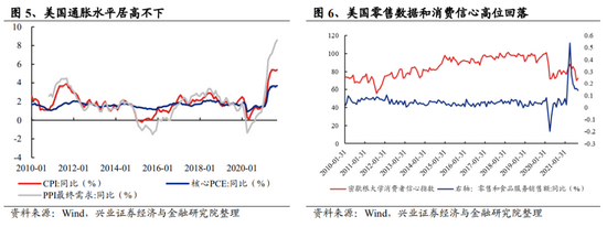 1、美国通胀水平居高不下,企业生产成本飙升,居民消费动能回落。今年以来,美国通胀水平持续超出市场预期,美国9月CPI和PPI同比增长5.4%和8.6%,续创金融危机以来新高,核心PCE物价指数同比增长3.6%,继续处于近30年高位,严重削弱经济增长动力。零售数据自4月以来高位回落,消费者信心随着物价水平持续攀升而大幅下滑,后续经济内生增长动力不足。