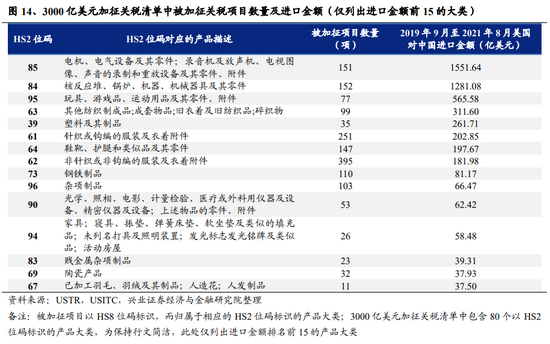 在清单中,纺织服装、食品、钢铁等大类项目数量排名居前,而电机及电气设备、机械设备、玩具等进口金额排名居前。从项目数量来看,非针织或非钩编的服装及衣着附件(HS2位码为62,395项)、针织或钩编的服装及衣着附件(HS2位码为61,251项)、乳制品蛋制品等(HS2位码为04,238项)、钢铁(HS2位码为72,219项)是被加征项目最多的产品大类;从美国对中国进口金额来看,测算2019年9月至2021年8月的进口金额,排名前三位的产品大类分别为电机及电气设备(HS2位码为85,1551.64亿元)、机械设备(HS2位码为84,1281.08亿美元)和玩具(HS2位码为95,565.58亿美元)。