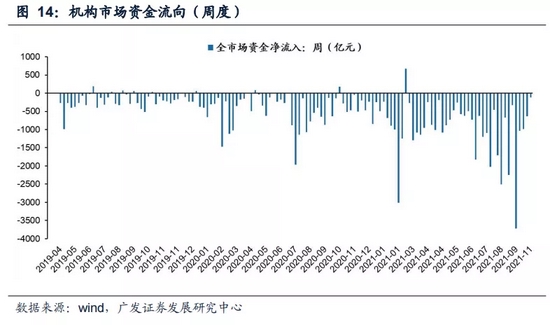 (5)陆港通北上资金流入净额:上周陆股通北上资金净流出27亿元,前一周净流入44亿元。截至2021年11月14日,2021年11月北上资金净流入17亿元,净流入行业前五名是电气设备、计算机、非银金融、采掘、化工,净流出行业前五名是医药生物、家用电器、有色金属、建筑材料、汽车。