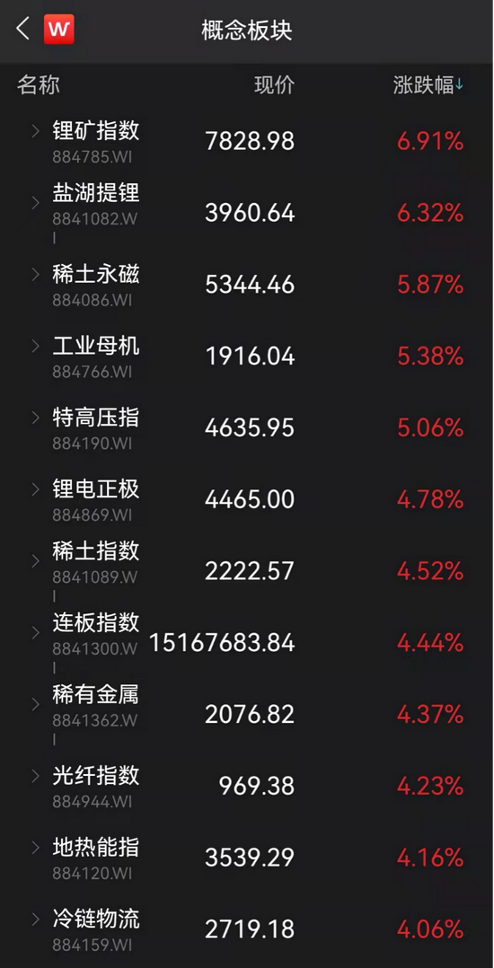 11月17日,截至收盘,锂矿、盐湖提锂指数分别涨6.91%、6.32%,领涨市场;稀土永磁、工业母机、特高压概念涨幅均超5%;锂电正极、稀土指数、稀有金属、光纤、地热能、冷链物流、风力发电概念涨幅均超4%。