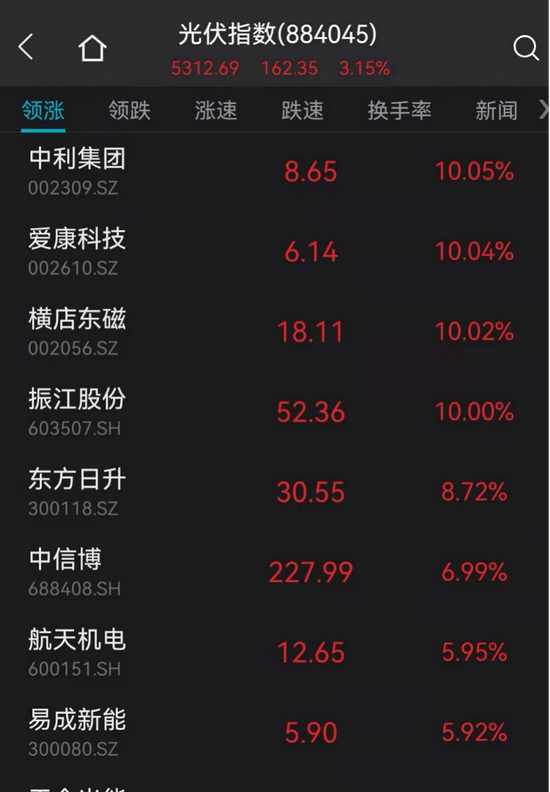 Wind光伏指数和风力发电指数应声上涨。截至收盘,Wind光伏指数大涨3.15%,个股中,中利集团、爱康科技、横店东磁、振江股份纷纷涨停。