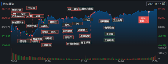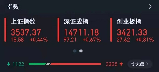 11月17日,A股三大指数集体上涨,截至收盘,上证指数涨0.44%,报3537.37点;深证成指涨0.67%,报14711.18点;创业板指涨0.81%,报3421.33点;沪深两市合计成交额10371.76亿元,连续第19个交易日突破1万亿元;总体来看,两市个股普涨。