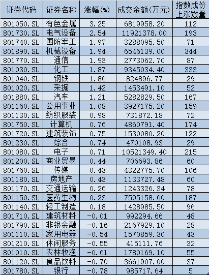 从申万一级行业来看,有21个行业实现上涨,其中,有色金属、电气设备等行业涨幅居前均超2%,涨幅分别为3.25%、2.54%;另外,银行、食品饮料、农林牧渔等行业则震荡走低。