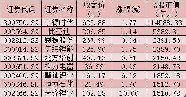 表:截至11月17日收盘总市值在1500亿元以上的锂电池概念股