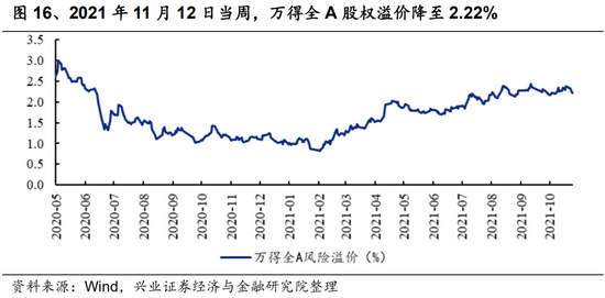 万得全A股权溢价可以间接反映投资者对经济和市场的风险判断及定价情况。2021年11月12日当周,万得全A股权溢价降至2.22%。