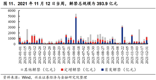 2021年11月12日当周,解禁总规模为393.9亿元,环比提升105.8亿元。其中,首发、定增、其他解禁的规模分别为153.4亿元、102.7亿元和137.8亿元。