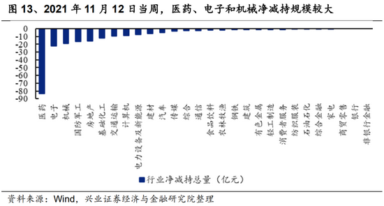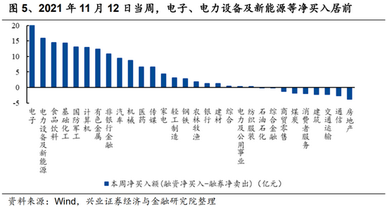 2021年11月12日当周,从行业的净买入(融资净买入-融券净卖出)来看,电子、电力设备及新能源、食品饮料、基础化工和国防军工板块的净买入居前,分别为49.9亿元、15.9亿元、14.5亿元、14.3亿元和13.0亿元;而房地产、通信、交通运输、建筑和消费者服务板块净卖出靠前,分别为3.8亿元、2.7亿元、2.3亿元、2.2亿元和1.9亿元。