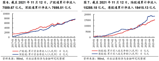 截至2021年11月12日,陆股通累计净流入15288.18亿元,其中沪股通累计净流入7589.67亿元,深股通累计净流入7698.51亿元;港股通累计净流入18415.13亿元。恒生AH溢价指数小幅下降1.6个点至142.73。