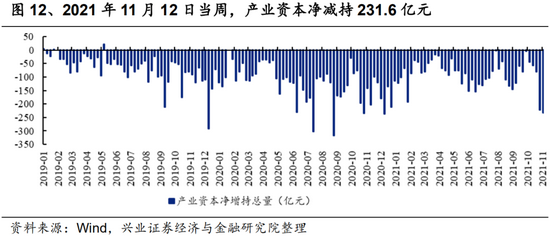 2021年11月12日当周,产业资本净减持231.6亿元,环比增加10.2亿元。其中,主板净减持128.0亿元,科创板和创业板分别净减持10.8亿元和44.1亿元。从增减持的具体行业分布来看,医药(82.93亿元)、电子(22.19亿元)、机械(18.69亿元)、国防军工(16.47亿元)和房地产(15.91亿元)净减持规模较大;综合金融(0.02亿元)、石油石化(0.25亿元)、纺织服装(0.40亿元)、消费者服务(0.73亿元)和轻工制造(0.86亿元)净减持规模较小。