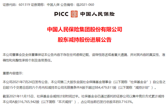 保险龙头中国人保今日盘后发布公告称,自2021年8月16日起至2021年11月15日期间,第二大股东社保基金会已通过委托的证券公司以集中竞价方式累计减持公司A股约3.17亿股,占公司当前已发行股份总数的0.7163%。社保基金会本次减持计划尚未实施完毕。