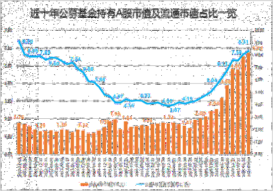 中国银河证券基金研究中心数据显示,截至2021年9月末,公募基金持股市值6.2万亿元,较2019年初增长4.7万亿元,增幅310.9%;其中持有A股流通股市值5.7万亿元,占A股流通股总市值比例为8.31%,较2019年初增长4个百分点。