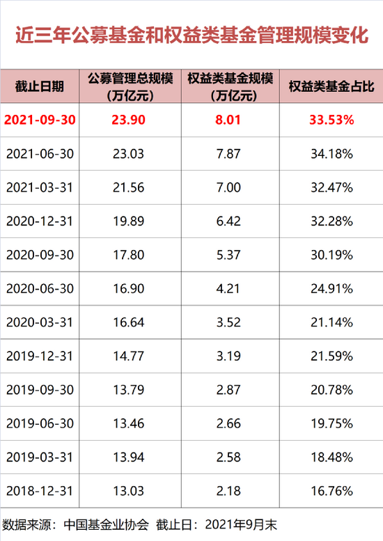 数据显示,截至2021年9月末,公募基金总规模为23.9万亿元,其中权益类基金规模超过8万亿元,权益类基金近三年激增近6万亿,实现了爆发式增长。