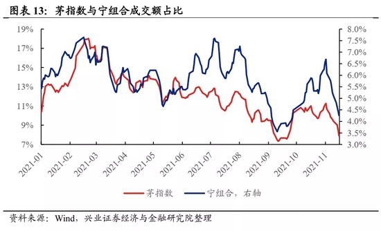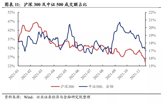 近五个交易日,深证成指、中证1000、创业板指和科创50成交占比走高,上证指数、沪深300、中证500、中证800、茅指数和宁组合交易热度有所下行。具体来看,截止2021/11/18,沪深300成交额占全部A股成交额的比重(MA5,下同)为24.11%,处于9.9%的历史分位,环比下降3.69%;中证500成交额占比为17.22%,处于12.2%的历史分位,较上周下降0.15%;中证1000成交额占比为24.53%,处于57.9%的历史分位,环比上涨1.53%;创业板指成交额占全部A股的比重为26.51%,处于98.1 %的历史分位,较上周上涨1.55%;科创50成交额占全部A股的比重为5.14%,处于93.9%的历史分位,环比上涨0.52 %。