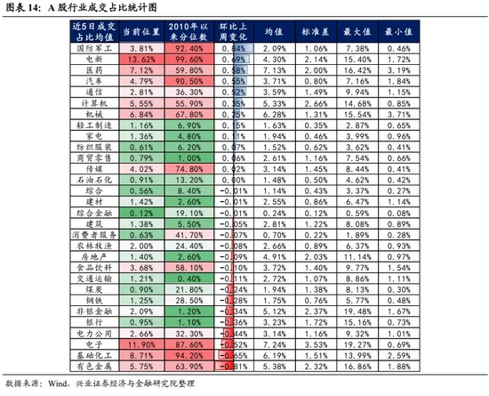 交易拥挤度前三的行业分别为电新(13.62%)、电子(11.9%)、基础化工(8.71%);