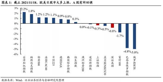 ——美国经济复苏强劲,叠加基建投资计划终落地,催化美股上涨;日本政府“大放水”刺激日股走高。第一,美国商务部周二公布10月零售销售额环比增长1.7%,高于市场预期的1.4%,创近7个月新高,指向美国总需求强劲;第二,部分龙头财报超预期,例如家得宝和沃尔玛公布的业绩均超出市场预期;第三,11月15日,拜登签署了规模达1万亿美元的基础设施法案,其中包括5500亿美元的新增支出,基建投资计划的落地有助于提振市场对美国的经济增长预期,此外,拜登政府表示要为港口基础设施拨款以缓解供应链瓶颈,该举措有利于缓解通胀压力。此外,据日经新闻报道,本周,日本决定从财政支出中拿出55.7万亿日元用于刺激措施,大规模的财政宽松政策刺激日股上涨1.1%。