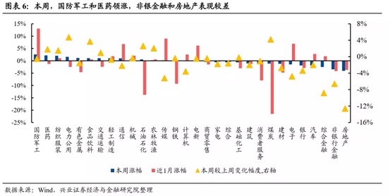 国防军工和医药领涨A股,房地产有所回调。首先,本周二,中美两国元首通话就新疆、西藏和台湾问题的讨论,叠加中国大陆警告台湾当局称,若挑衅逼迫甚至突破红线将采取断然措施,催化国防军工板块上涨。其次,11月16日,21世纪经济报称辉瑞及默沙东称可能与中国CXO企业合作生产口服小分子新冠病毒治疗药物,叠加上周落地的医保谈判好于预期,医药行业本周上涨2.18%。最后,本周公布的地产数据进一步走弱,竣工和销售面积当月同比均降至-20%以下,较大的下行压力拖累房地产行业下跌超4%。