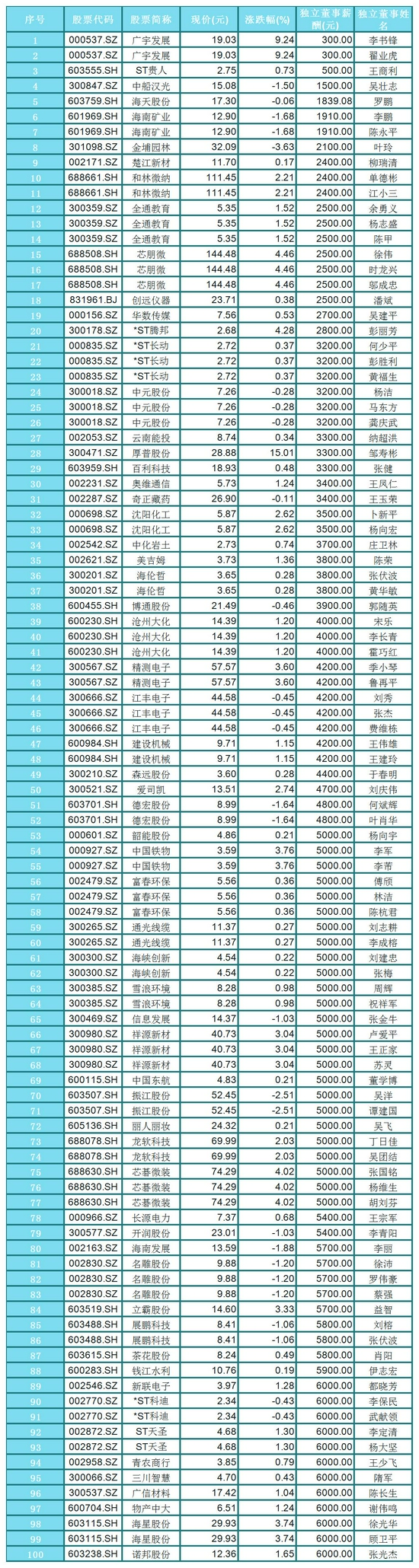而从排行榜末尾看齐,薪酬排名后100位的董秘最高年薪不过6000元,最少年薪则为300元。