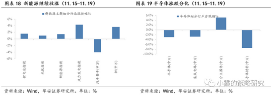 估值维度,锂电池、光伏和风电等新能源,以及半导体估值均保持稳定。截止11月19日,锂电池估值分位数位76.4%,光伏指数估值分位数86.9%,风力发电估值分位数49.1%,半导体估值分位数20.1%,整体较前一周保持稳定;