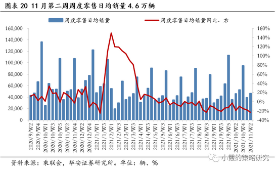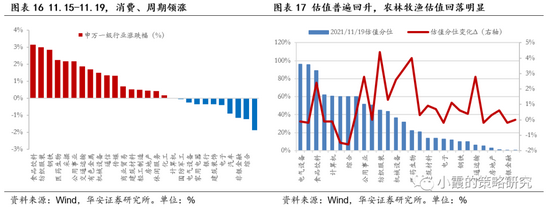 消费关注缺芯影响缓解的汽车结构性机会。11月第三周汽车板块表现略有波动,整周小幅下跌0.9%。汽车板块来看,随着MCU芯片的逐步缓解,汽车产量前期受到抑制的因素减弱,带来销量的回暖。根据乘联会周度数据,受到10月生产改善支撑,11月第二周的狭义乘用车市场零售日均4.6万辆,表现平稳,且有一定程度的回升。同时,生产端的压制缓解,也将带来提车周期的缩短,带动销量的回升。估值维度,汽车估值延续稳定。截止11月19日,汽车估值分位数位95.5%。