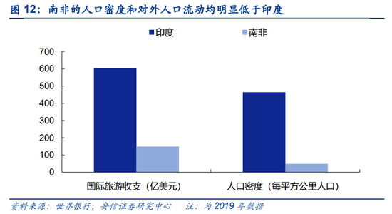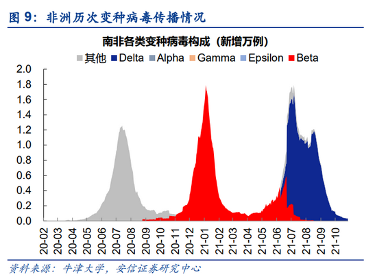 人类的恐慌来自于未知。目前来看,虽然Omicron在南非境内传播非常迅速,甚至已经超过Delta,但市场和医学人员对于变异体B.1.1.529的认识还处于初步阶段,其传播范围、感染特性和现有疫苗有效性仍缺乏足够深入的研究。回顾历史上历次变异病毒传播情况,当出现一种传播能力更强的毒株后,往往引发新一轮疫情传播,新的更具传染性的变种病毒逐步在传播中占据主导地位,比如今年以来快速传播的Alpha(最早于英国发现)和Delta(最早于印度发现)变种病毒。此外,除了病毒自身特性,病毒能否快速传播还取决于各国采取的防疫措施以及人口流动情况,比如今年年初于非洲最早发现的Beta变种病毒实际上基本没有对发达国造成明显冲击,其影响明显小于印度的Delta变种病毒(参见下图);背后的原因可能部分在于,相比于印度,南非人口密度更低、对外人口流动更少,使得疫情传播相对更弱。