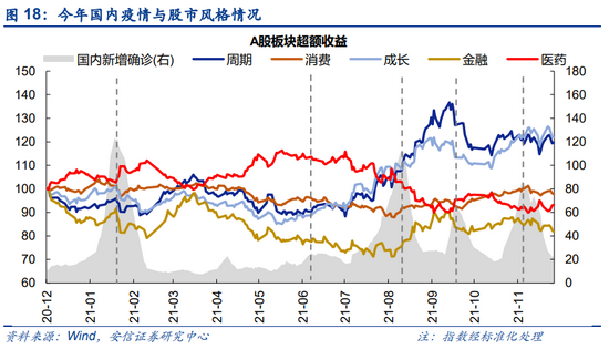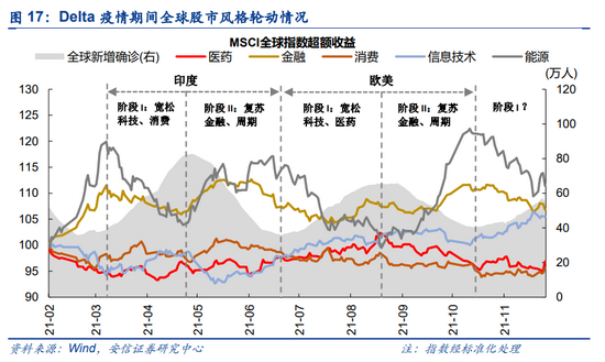 疫情传播将会如何影响股票市场风格?投资者也试图总结一些规律:根据Delta疫情期间全球股市表现,在疫情反弹阶段,市场交易疫情和宽松预期,科技和医药消费明显跑赢,而与经济强相关的周期和金融板块大幅跑输;而随疫情改善,市场交易经济复苏和流动性收紧预期,周期和金融明显跑赢,而科技和医药消费板块则明显跑输。