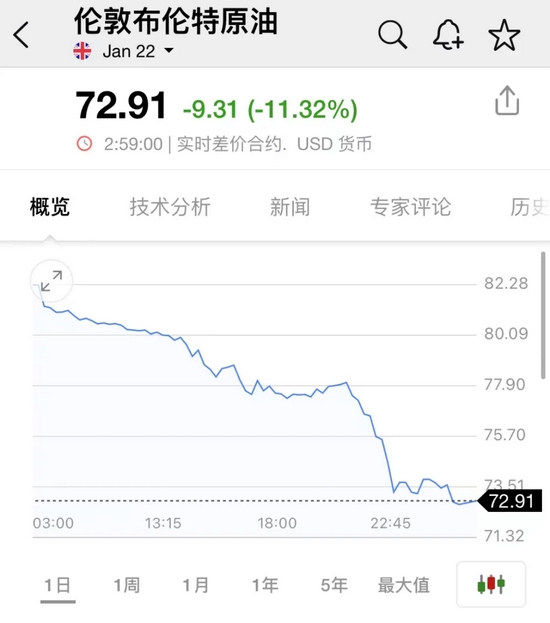 布伦特原油期货跌超11%。