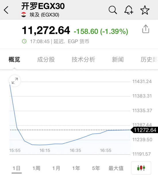 开罗EGX30指数跌超1%。