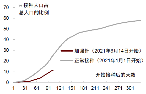 疫苗接种方面,我们正处于初次接种和加强针之间的“换挡期”。Delta疫情在4月爆发,在美国的大范围传播发生在7~8月,当时欧美发达国家处于疫苗接种的快速爬坡期,疫苗的保护力也比较强。当前情况不同,第一批次接种的疫苗保护力已随时间开始下降,加强针的接种又尚未完全铺开。根据德国疾病预防中心罗伯特-科赫研究所(Robert Koch Institute)的数据,德国的全面疫苗接种率接近70%,但近期死亡与重症人数正在快速上升,而且超过45%的新冠住院病人是已经完全接种过疫苗的。此外,美国接种加强针的速度比年初接种第一批次疫苗时更慢,建立免疫屏障的时间可能更长。退一步说,即使加强针接种提速,考虑到冬季圣诞假期即将来临,人们外出度假、娱乐活动频次增加,疫情传播的风险也会更高。