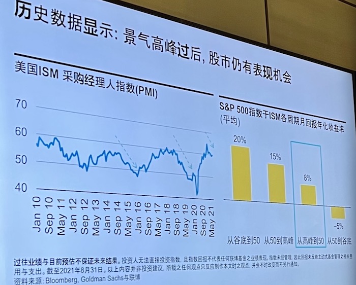 此外,历史数据显示,景气高峰过后,股市仍有表现机会。他表示,股市表现一般是在PMI从底部回升至50荣枯线的阶段回报率最高(历史统计平均回报约20%),第二好的阶段是从50向上攀升的阶段(15%)。如今美国处于PMI从高位开始放缓的阶段,这一阶段美股仍会产生正回报,只是根据过去的统计,回报率大约降至8%。