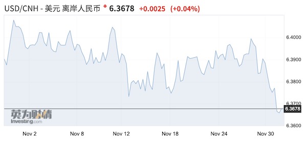 截至北京时间12月1日15:15,美元/离岸人民币报6.3672,比10月下旬美元指数突破94大关时的6.42仍强了不少,显然人民币不仅和美元指数脱钩,甚至呈现了负相关性。