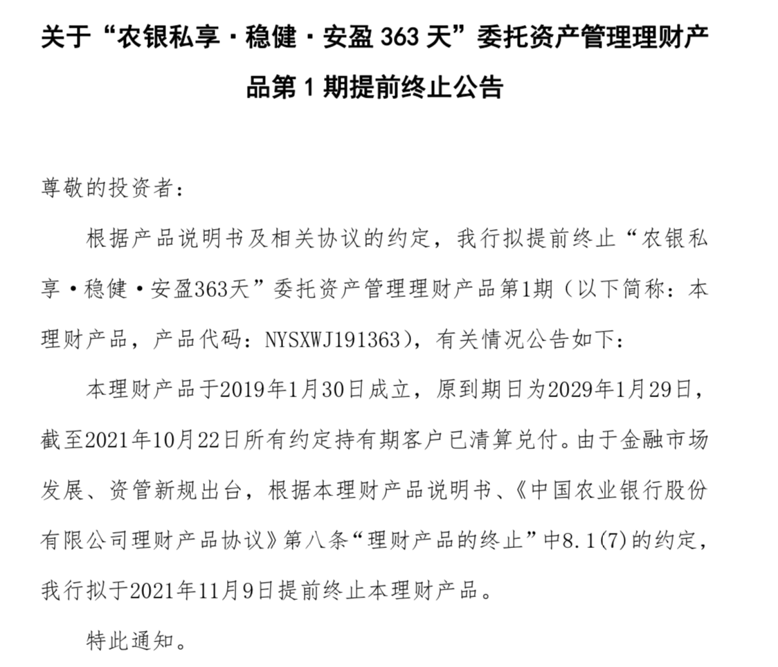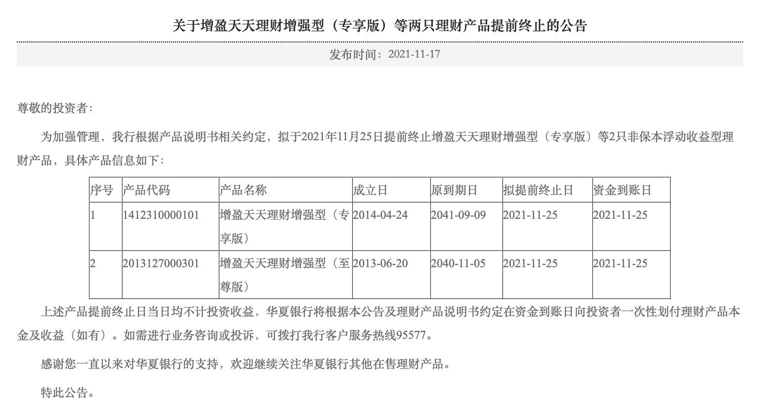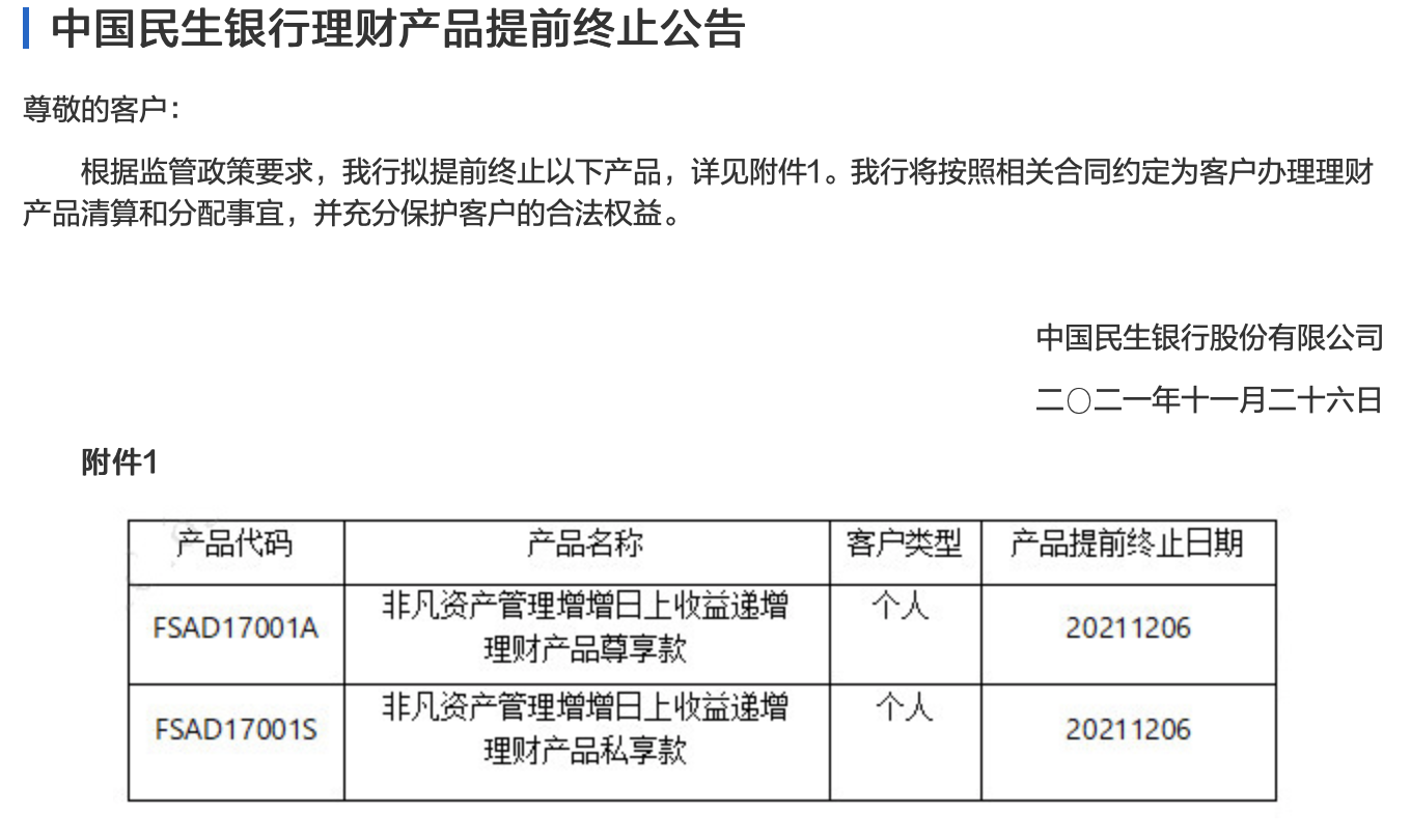 比如,11月26日,民生银行发布公告称,根据监管政策要求,拟提前终止非凡资产管理增增日上收益递增理财产品尊享款及非凡资产管理增增日上收益递增理财产品私享款两款产品;11月17日,华夏银行发布公告称,拟于11月25日提前终止增盈天天理财增强型(专享版)等2只非保本浮动收益型理财产品;11月10日,农业银行发布公告称,拟提前终止“农银私享·稳健·安盈363天”委托资产管理理财产品第1期。