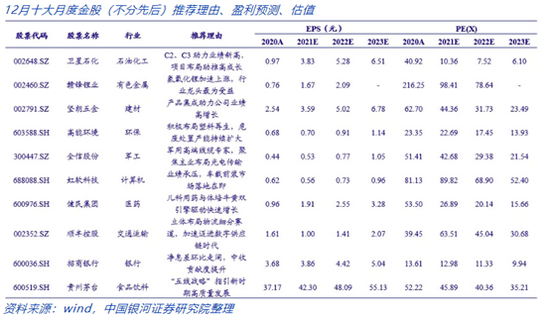 12月,中国银河推荐的金股为:卫星石化、赣锋锂业、坚朗五金、高能环境、全信股份、虹软科技、健民集团、顺丰控股、招商银行、贵州茅台。